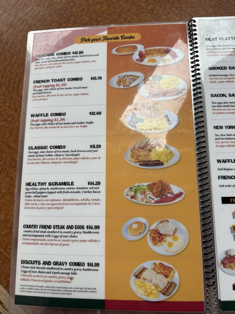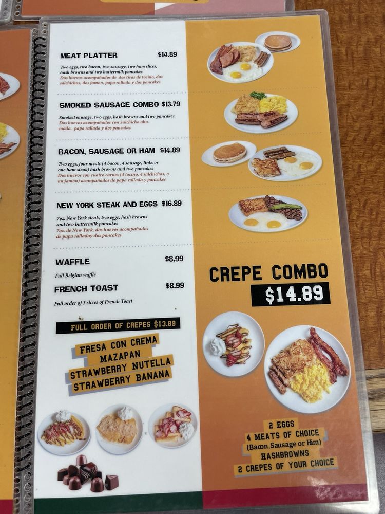 Fruit topping for an additional charge. 2 eggs, your choice of 2 types of meat, French toast and hash browns. Dos huevos, dos carnes, hash browns y French toast.