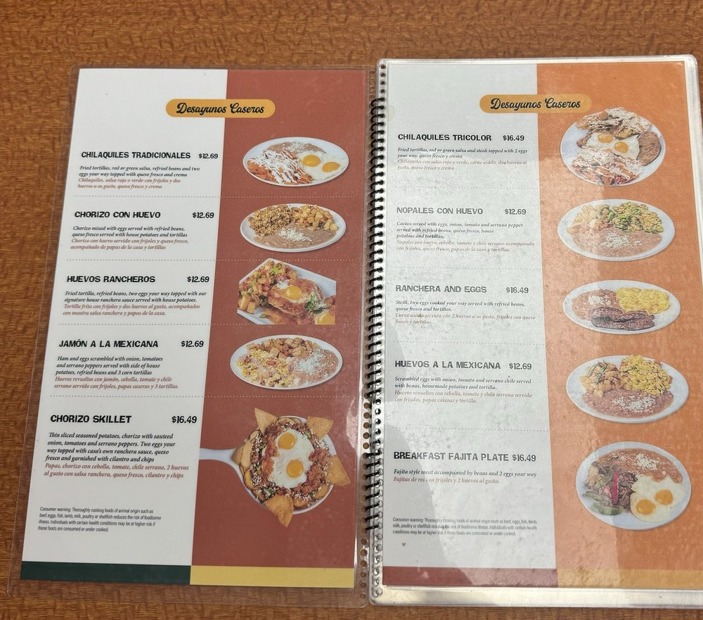 Flour tortilla, red and green chilaquiles, carne asada, scrambled eggs, refried beans, queso fresco, sour cream.* Tortilla de harina, chilaquiles roles y verdes, carne asada, huevos revueltos, frijoles, queso fresco y crema.