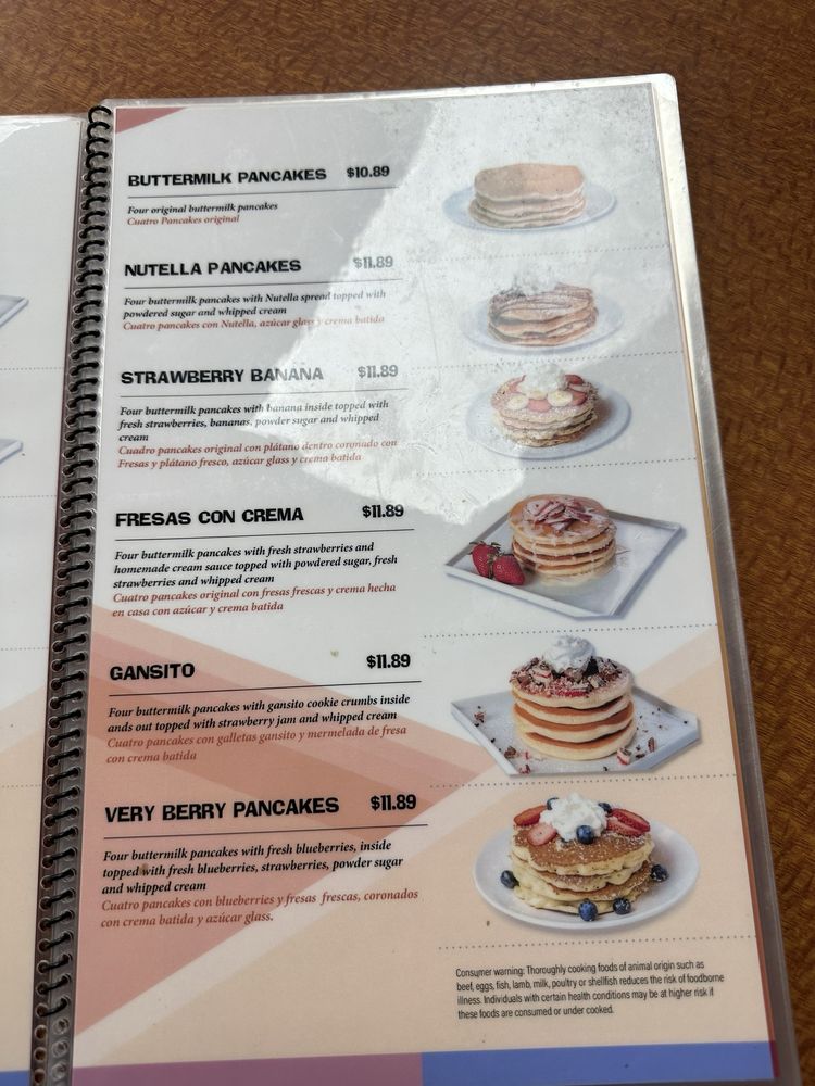 4 small pancakes, 1 egg and choice of meat. Cuatro panqueques chicos, un huevo y carne. Su eleccion.